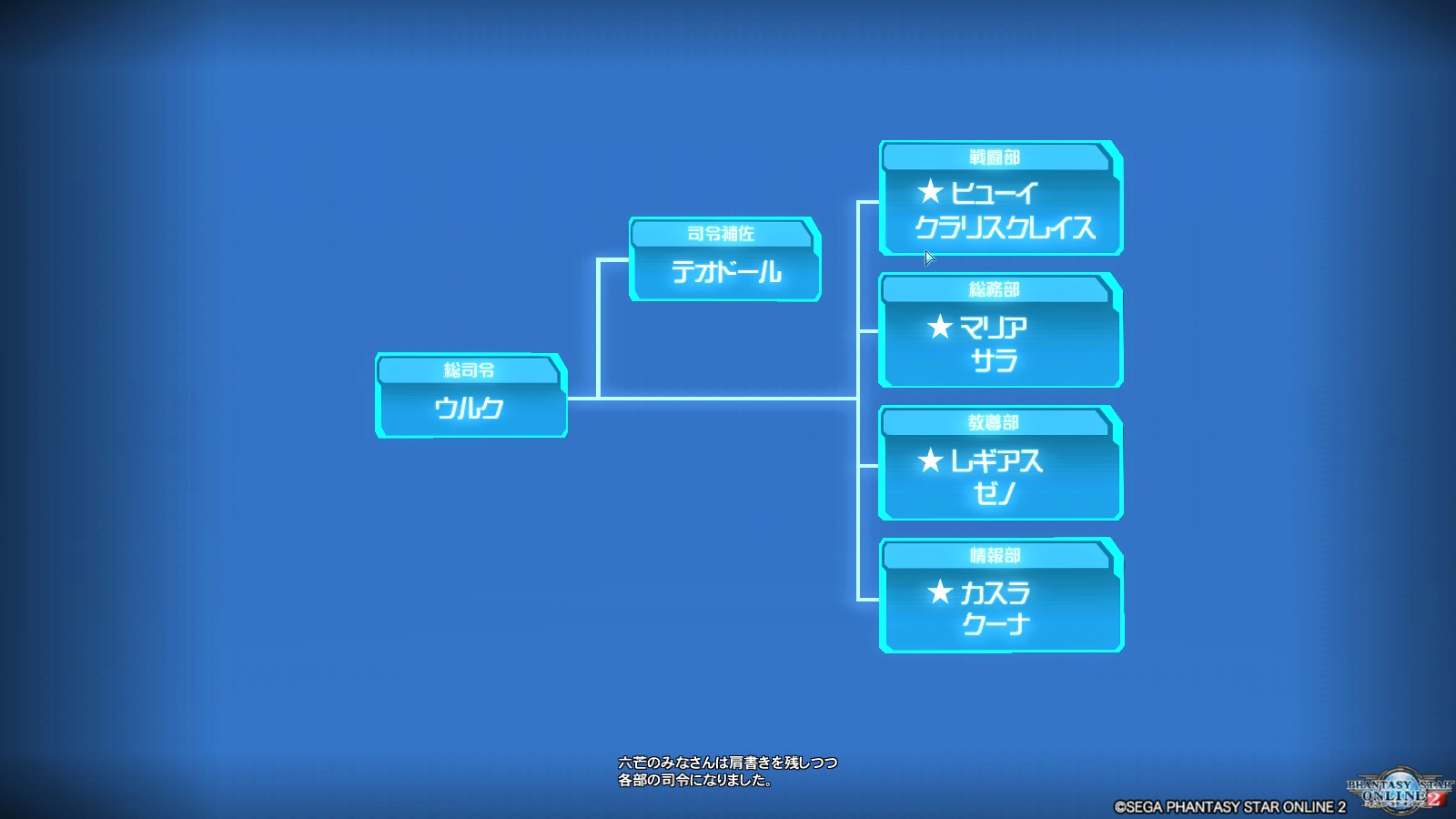 シャオはマザーシップに引きこもり、初めて会った時「フォトン適性がないためにアークスになれなかった」と嘆いていたウルクが総司令で、初めて会った時「別にアークスになりたかったわけじゃない」と愚痴っていたテオドールが補佐。