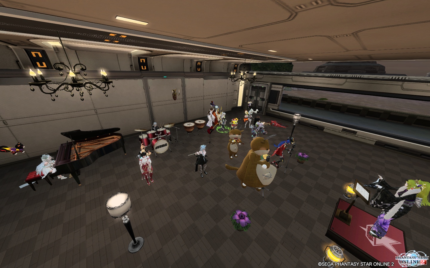 それはチームメンバーのログイン数がかなり多かったある日。新しくメンバがーが増えたこともあり、この時は15人ぐらい確かログインしていました。「それなら、チームメンバーだけで楽器のフル演奏できるわねえ」という話になり、手の空いた人に集まってもらいました。…しかし指揮台に人が上がると、全体をSSに収めるのがなかなか難しいです。