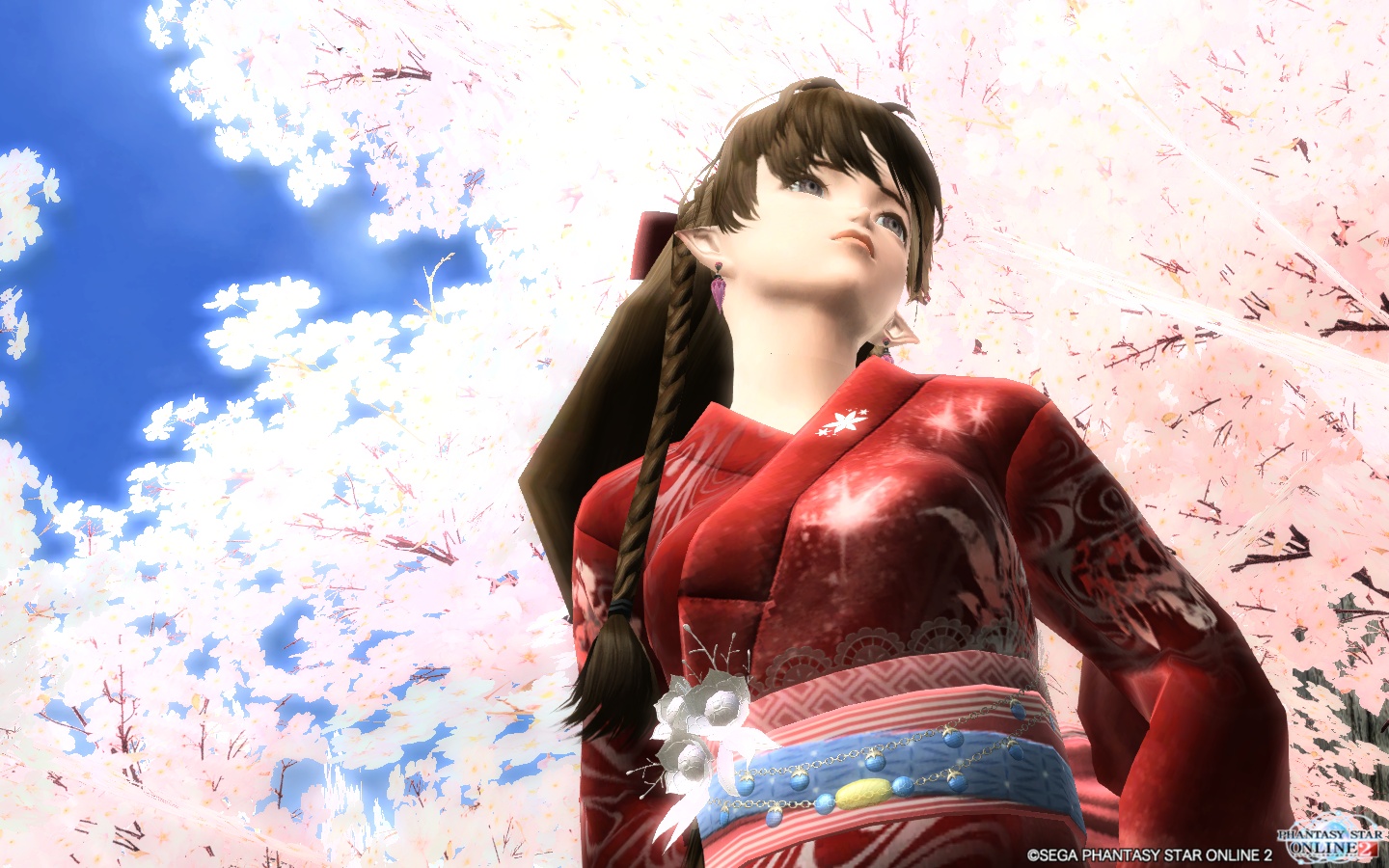 今回はエネミーを利用した視線移動は諦めて、カメラアングルを下から見上げるように調整しての撮影です。何とか桜を見上げている風にみえるのですが……エレナ、このアングルだとちょっと可愛くない気も…。