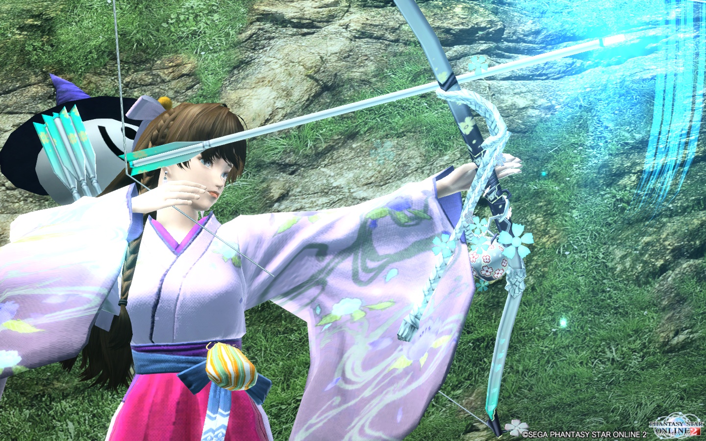 なーんか手の位置がズレてるように見えません? 矢をつがえてる方の手が特に顕著。普通にプレイしていて、弓を撃っているときは全く気にならないのですが、こうやってアングル変えて大写しにすると、意外に粗が…(笑)。…そんなわけで武器を持っての撮影はこれぐらいで切り上げました。