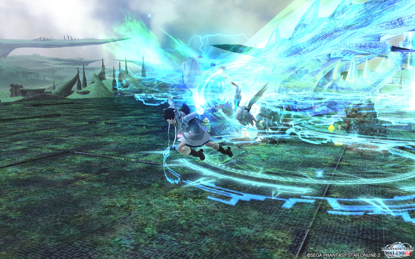 今回新しく追加された複合術「ザンディオン」を使っているところです。この術式、風と雷の複合で、背中にフォトンの翼を生やして無敵状態になり、そのまま突進してダメージを与えるというものです。実際使うととても派手でむやみに人に見せたくなるのですが(謎)、これをSSで撮ろうとすると、なかなか難しいのです。特にフォトンの翼を展開しているところが、なかなかうまく映らない。上のでまだまともに撮れたほうなのです。