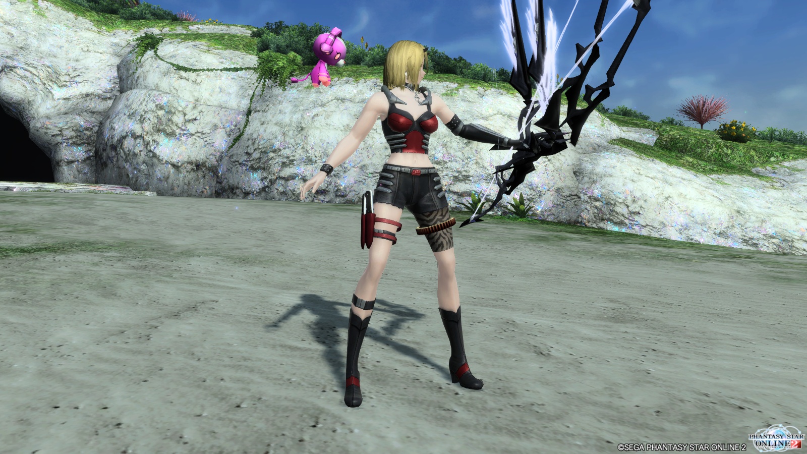 エリスが着ているのは『レイキャシール・レプカC』です。最近カラーリングを変えたため、それに合わせて赤基調の見た目となっています。レイキャシール=キャスト女性のレンジャーを意味します。といってもエリスは射撃武器持たないんですけどね(笑)。