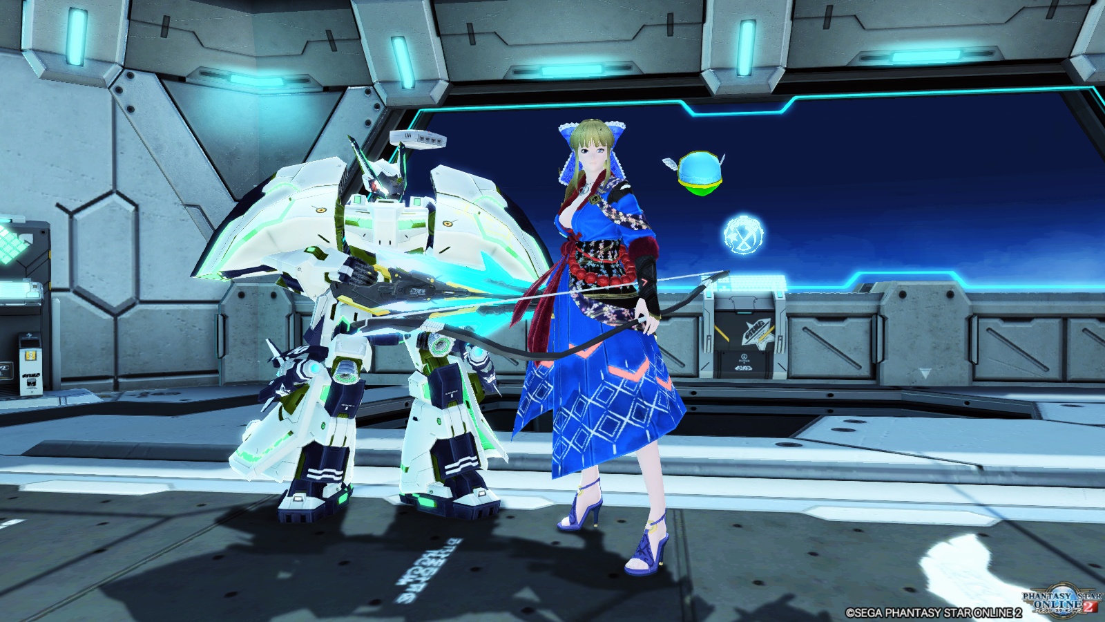 TOSはこの白が基調のヘビーフレームの他、紺が基調のライトフレーム、人間時と3つの姿を持っています。というのもこの格好でガンナーやると、重そうな機体がくるくる空中を舞うのですが、その違和感たるや半端じゃなく、「もっと軽そうな見た目のほうがいい」という理由でライトフレームが急遽組まれました。通称「中の人」という人間モードになってることもありますが、これはごく最近からのことです。