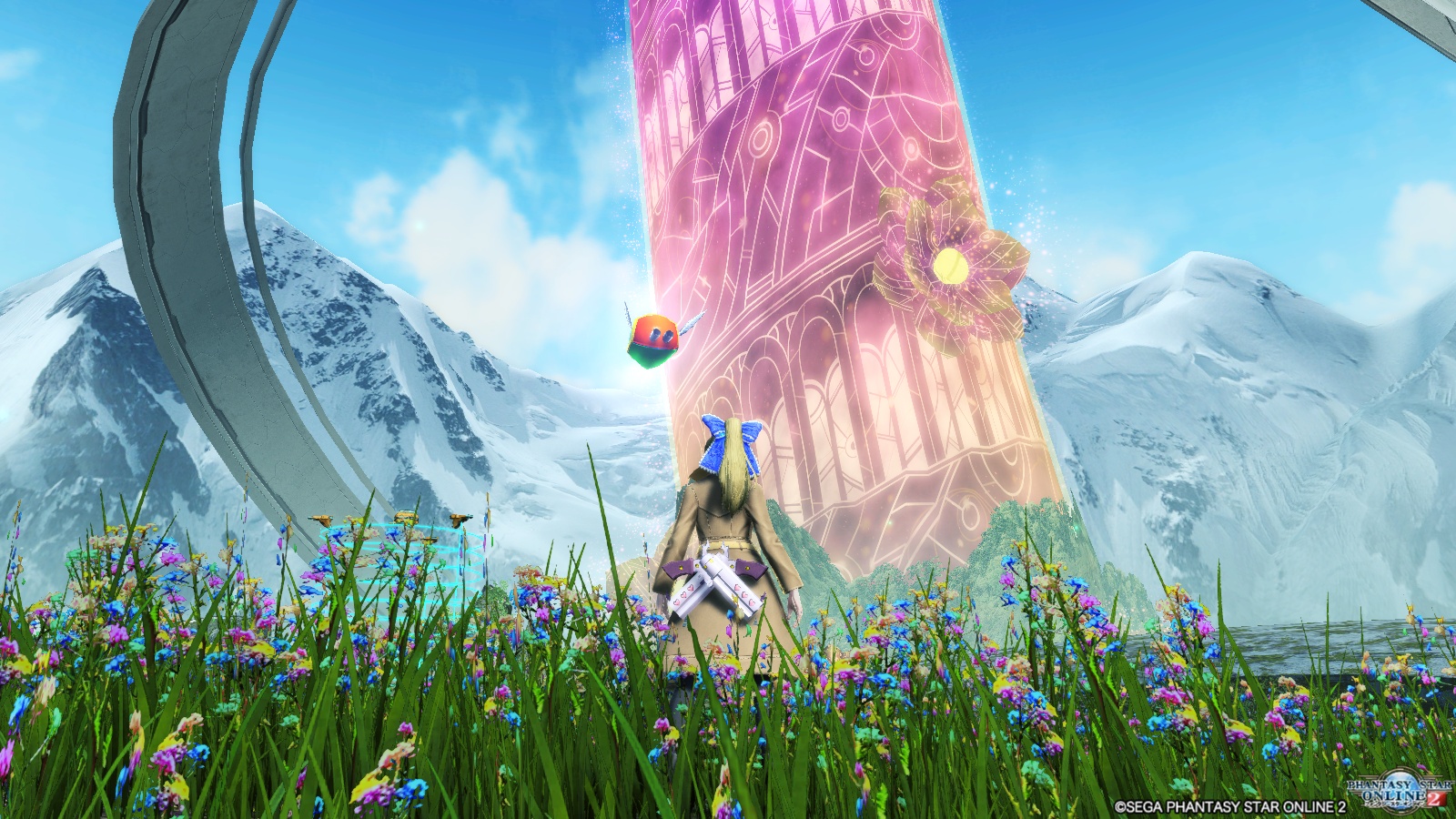 遺跡最奥、ゼッシュレイダを倒した後に撮った景色です。深淵なる闇との戦いの後の「帰還の場」と似た雰囲気です。この花々もちゃんと風に揺れるので、とても綺麗な景色になりました。
