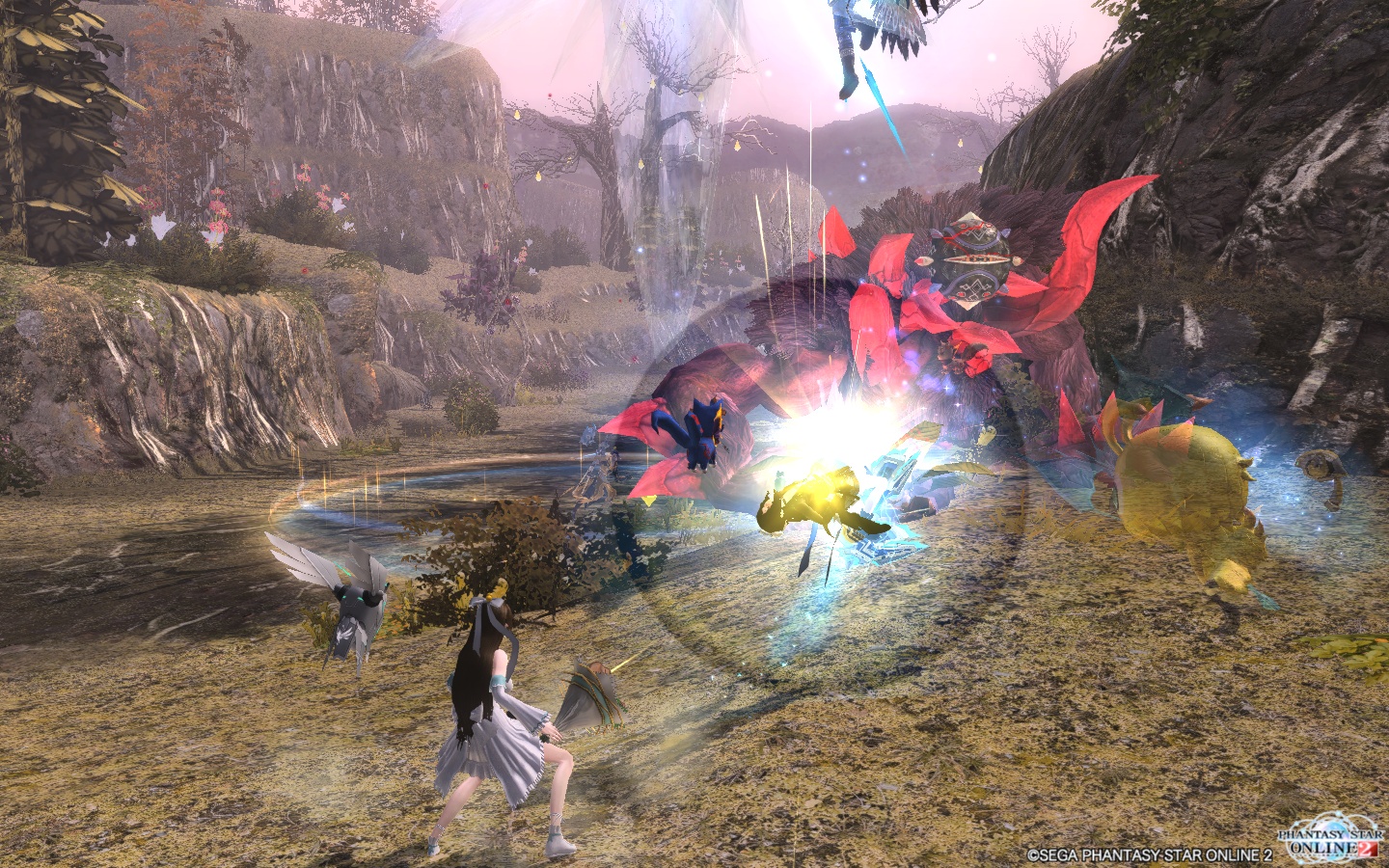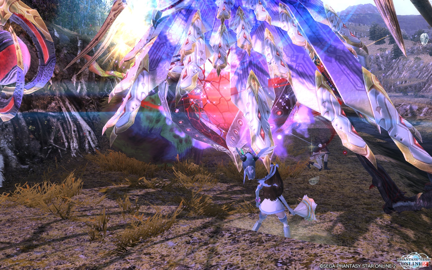 採掘場跡フリーのボスです。ダーカー系ボスの中では今のところ最強の呼び声も。ただ、レンジャーだと割とお得意様に近かったりします。採掘基地防衛戦で登場するものに付く二つ名は「堕の翼」と変わるようです。方針としては飛ばしてくる2つのリングに順次WBを貼って破壊し、ダウンを奪うのが良いかと。壊したリングはダウンから復帰後に一緒に復活し、耐久力が増えます。つまり壊すたびに固くなっていくのです。