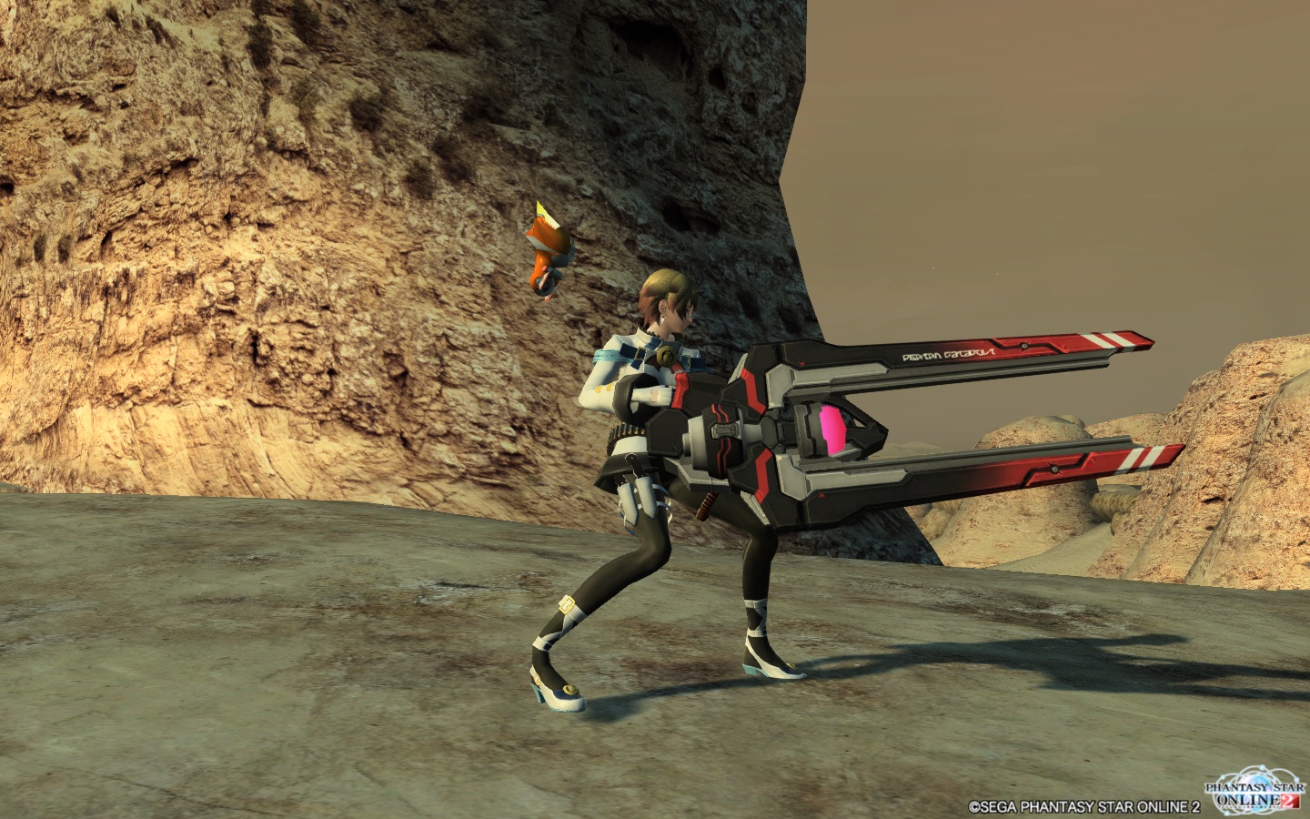 というのも、男性テクターはまともに持てる短杖迷彩があまりなくて非常に残念な気持ちだったからです。でも今回のは「これどこが短杖?」というようなゴツイ剣の見た目なので、男性が遠慮なく振り回せるかなと。おそらく必殺技が炎とか氷とかなので、その表現で短杖迷彩にもなったのでしょうねえ。