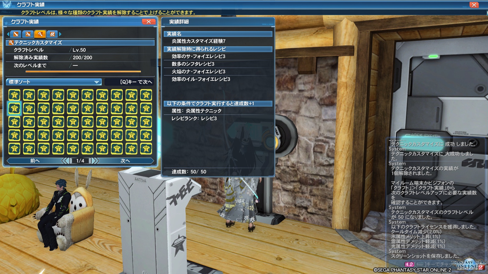 テクニックカスタマイズのクラフトレベルがとうとう50に届きました。出来たって人を見たことはあるのですが、自分でも出来るとは実はあんまり思ってませんでした(笑)。ただ、ランク3レシピをゴリゴリやってたら、結構実績が埋まっていたんですね。一番の難関かと思った「大成功250回」の実績が思いのほか すぐにクリアでき、すると残っているのは 幾つかの属性の最後の実績だけになっていたのです。
