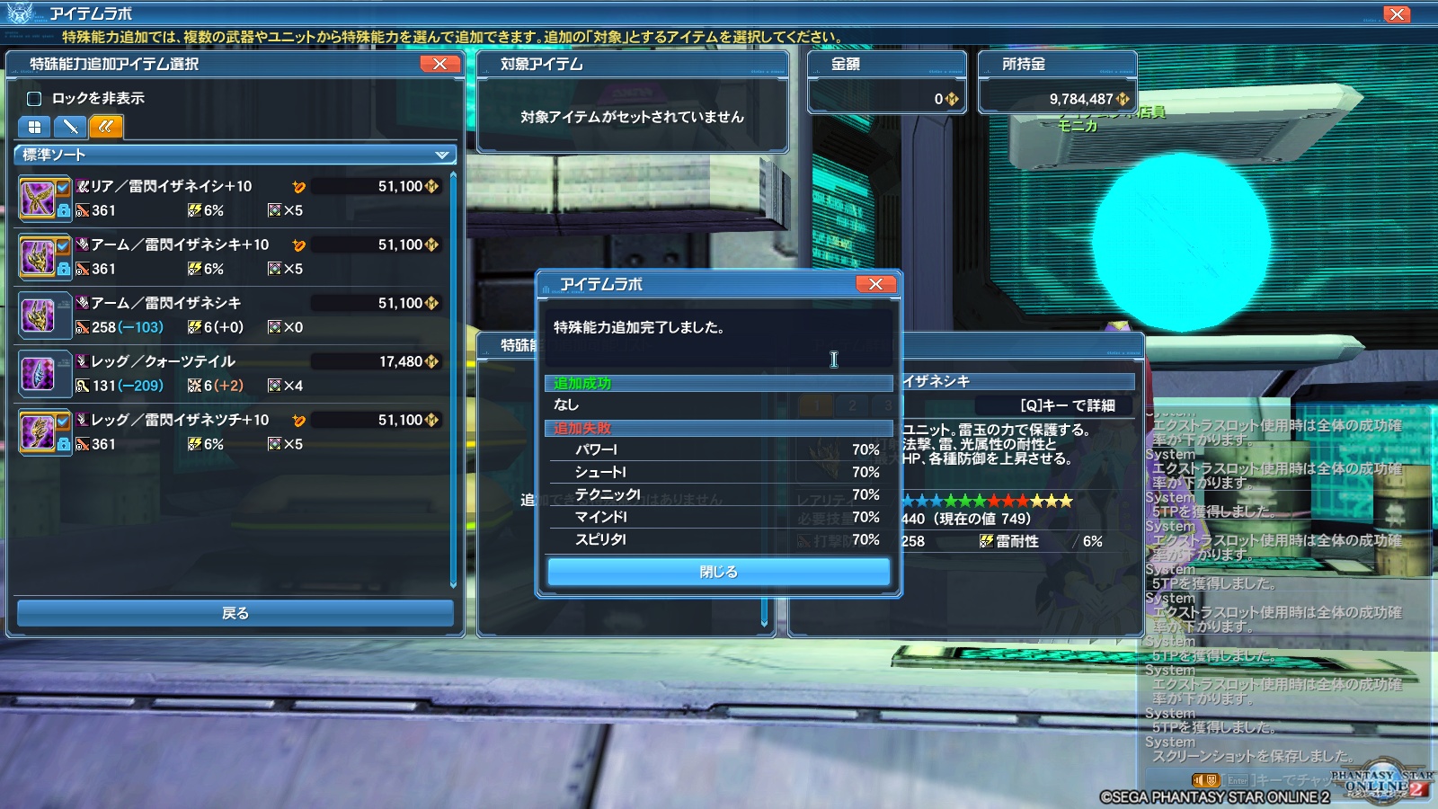 先日、倉庫を整理する目的で、幾つかの★12ユニットを せめて5スロットにしようとしました。といっても本腰を入れるわけではないので、4~5スロのユニット2つを素材とし、能力付与成功率+10%を使っての運試しみたいなものです。武器強化で山ほどもらえますよね。そうしたら、こんなことが起きました。