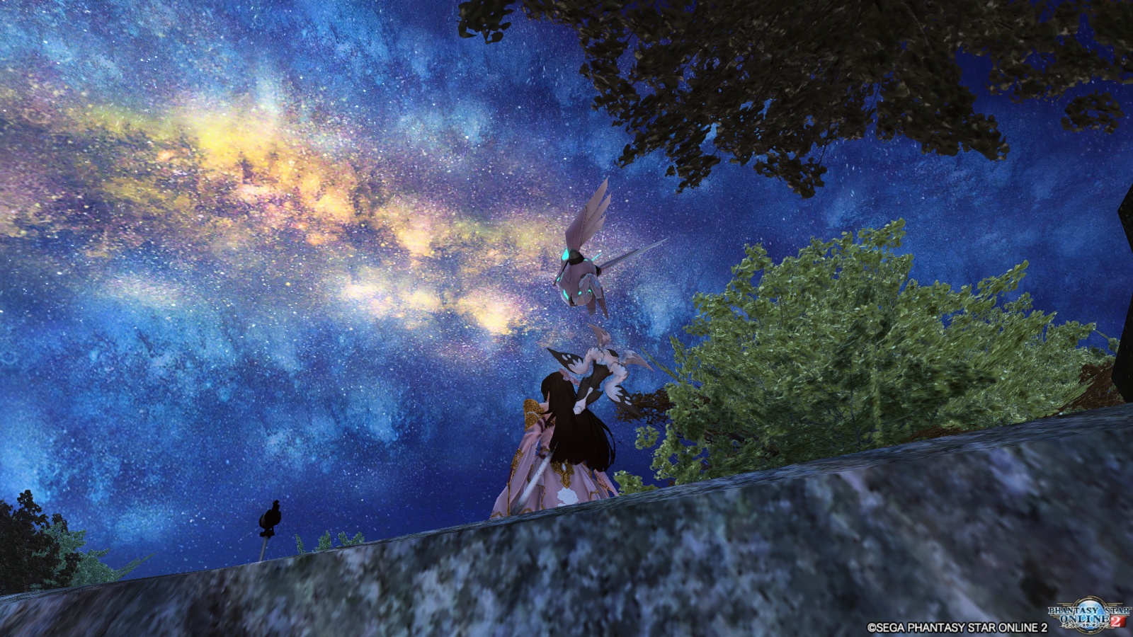 新しいチームルーム「渓流拠点」は「川辺でみんなでキャンプ」という感じで、とても涼し気なSSを取りやすく工夫されています。そして夜になって空を見上げると、とても綺麗な星空を楽しめます。