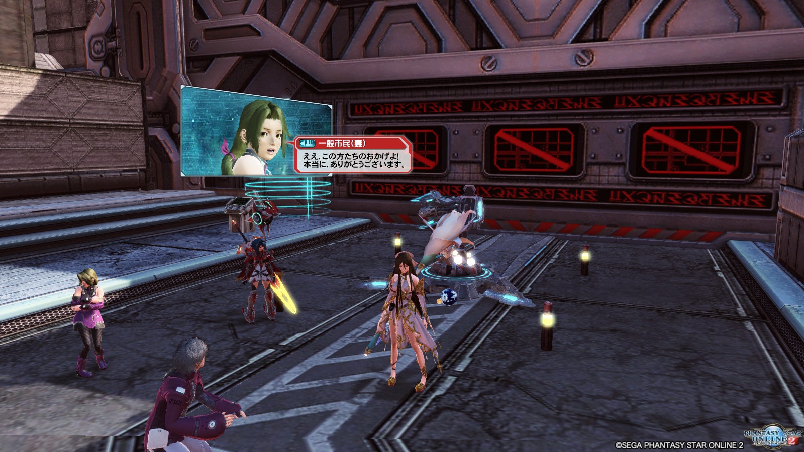 ただ今回のクエストはただエネミーを倒せば良いというわけではなく、逃げ遅れた一般市民の救出も必要です。一般市民が一時的にパーティーに入るので、HPを0にならないようにして少し先にあるテレポーターまで連れて行かなければなりません。エネミーは容赦なく一般市民にも攻撃してくるので、そうなる前に倒すことを心がけないと、割と簡単にクエスト失敗になります。