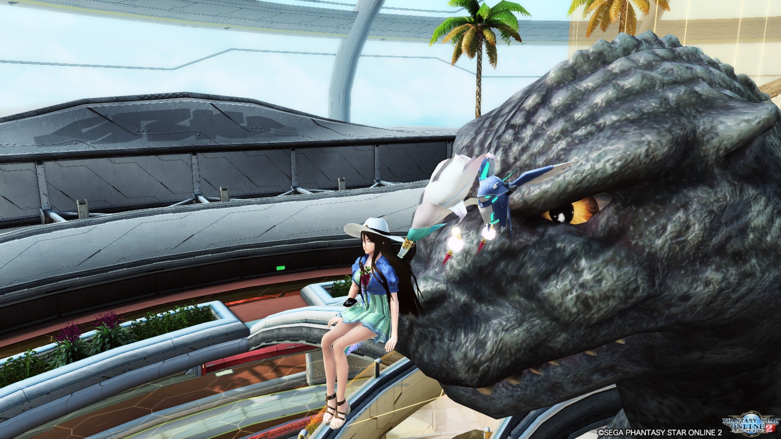ロビーに立っているこの方は温厚なようでこんな鼻先に座っても心持ち笑顔に見えます。といっても時々背びれが怪しげに光って不穏なものを吐き出してますが(笑)。尻尾の方にも座れるので、そのオブジェクトとしての大きさが知れるというものです。