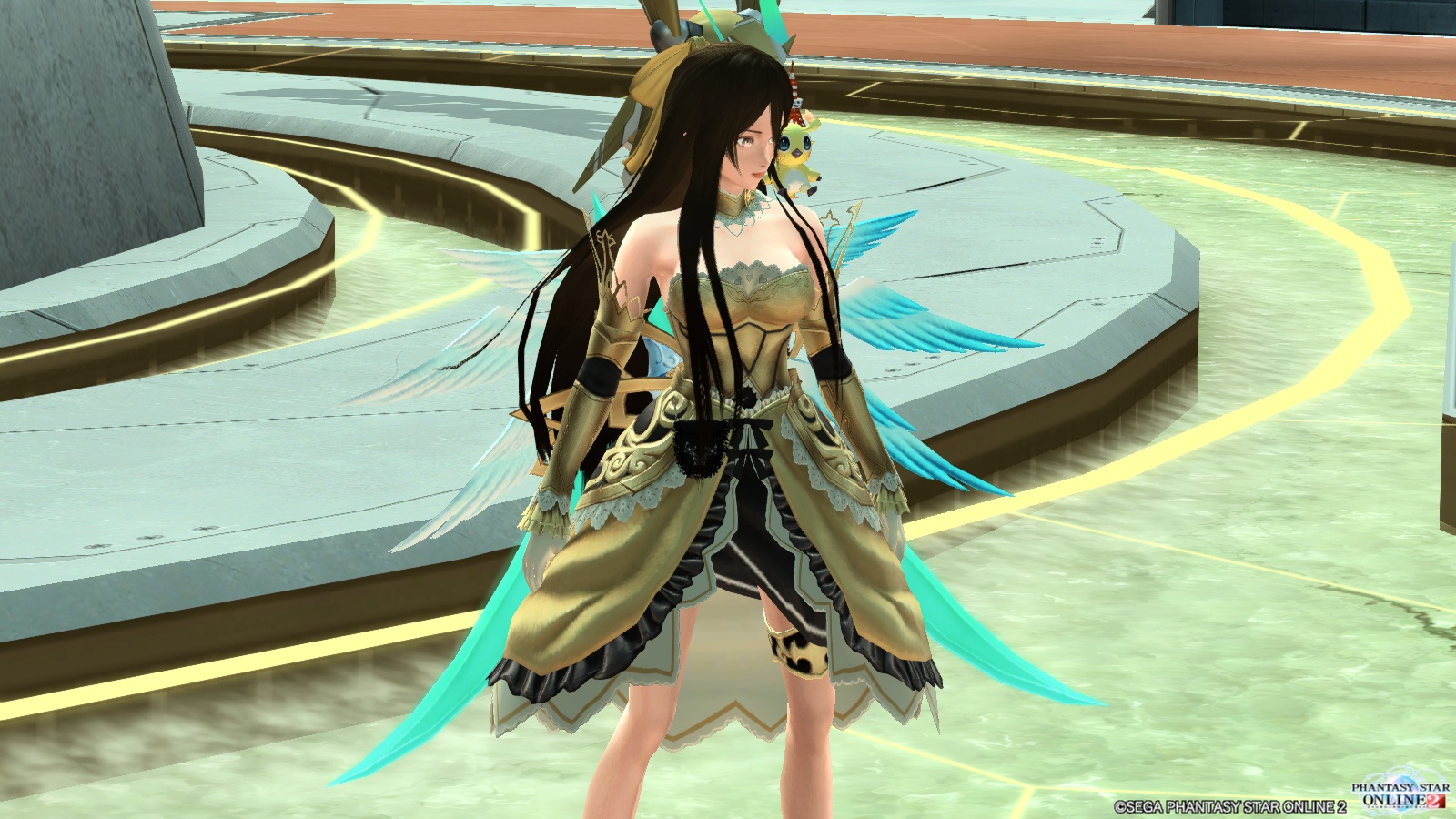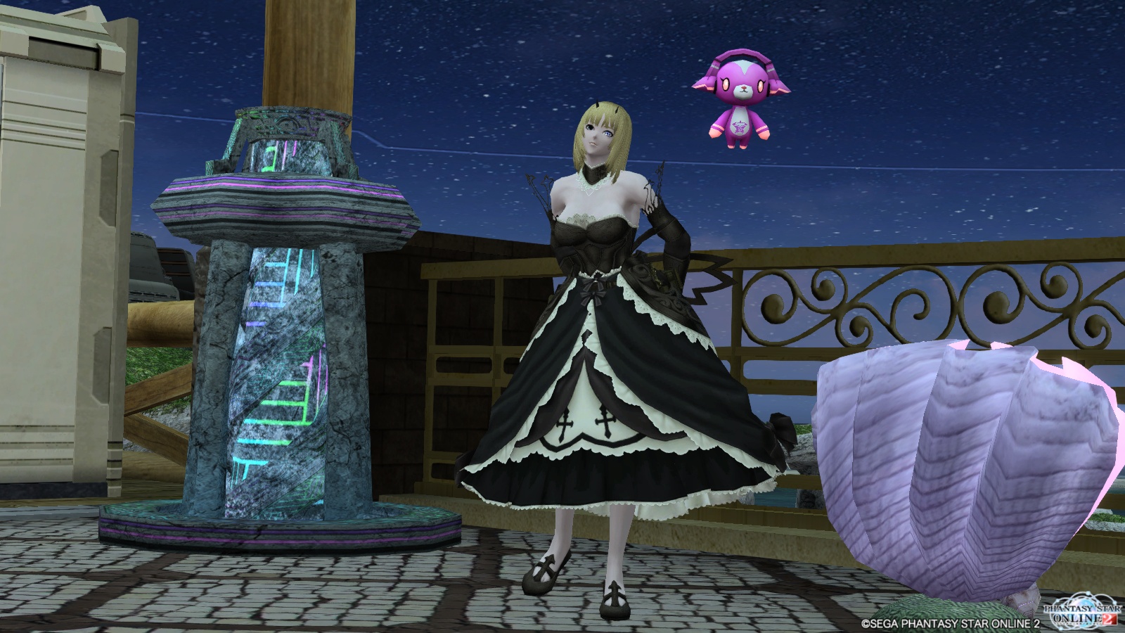 『ジーナス・レプカ影』を着ています。これもいただきもので、自力ではオリジナルカラーを引き当てています。元々のオリジナルは男性用の服ですが、上着がボレロのような丈の短さなので、女性向けと言っても過言ではないデザインですね。それでも 影 であればコートのように見えなくはないかなというところ。