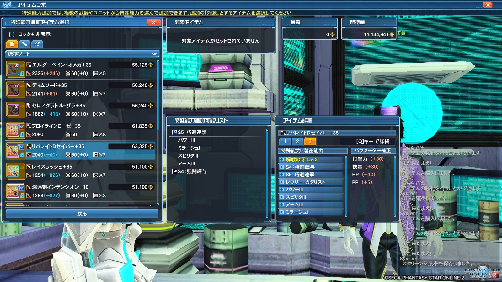 そうしたら、やっぱりそこそこに凄いOP付けてあげたくなるわけです。リバレイト武器はS4とS5がつけられます。このうちS5はアイテム使用でつけるものが決まっていたのですが、とりあえず上の画像のとおり、ノヴェル武器のS5を入れた状態にしました。そして付けるOPについては