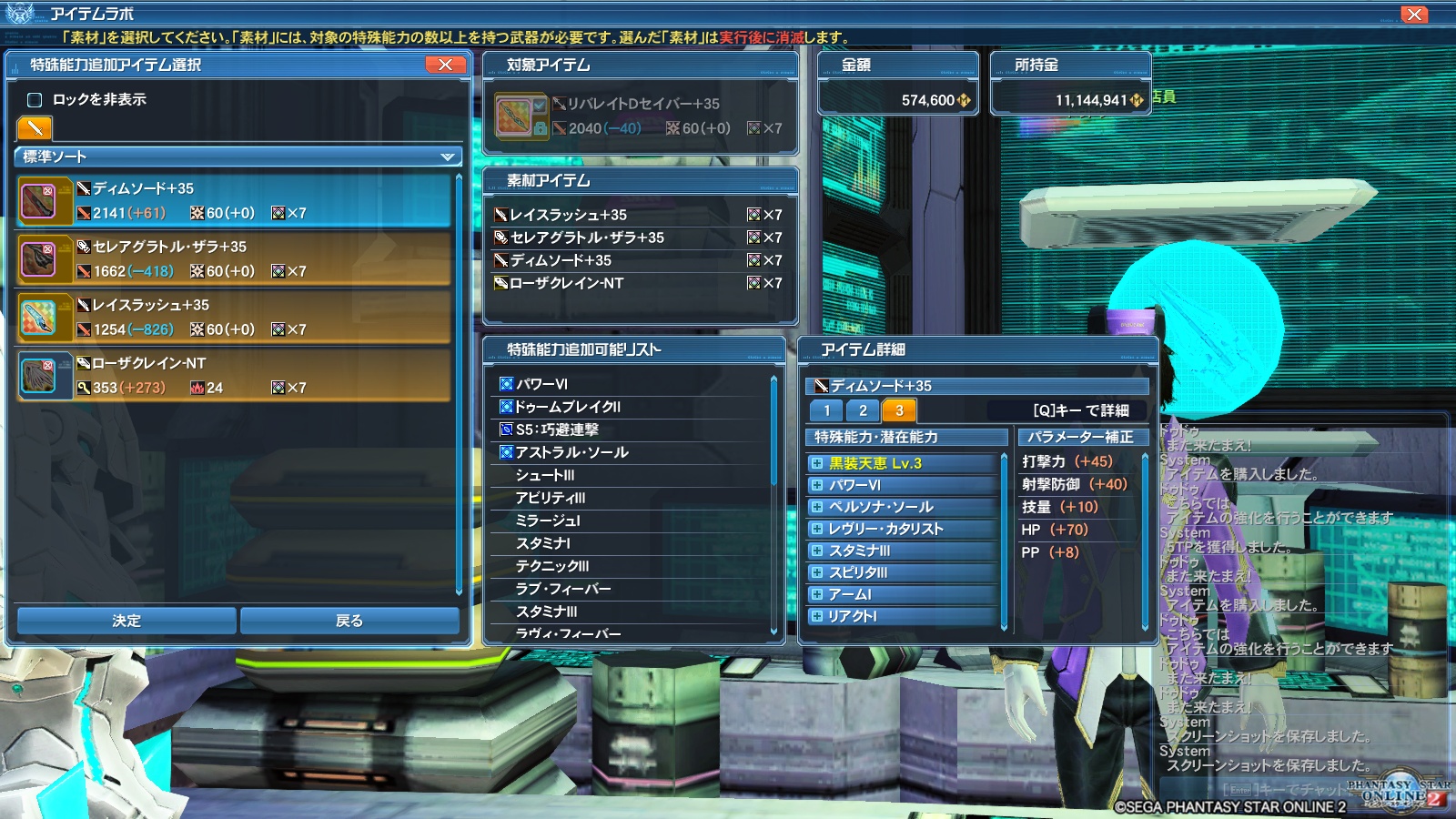 もちろん一発で全てうまくいくわけもなく何度か失敗し、そのたびにメセタを溶かし、それでもどうにか頑張って素材を揃えました。あ、上の画像に加えてレヴリーカタリストが付いた武器をもう一つ用意しています。