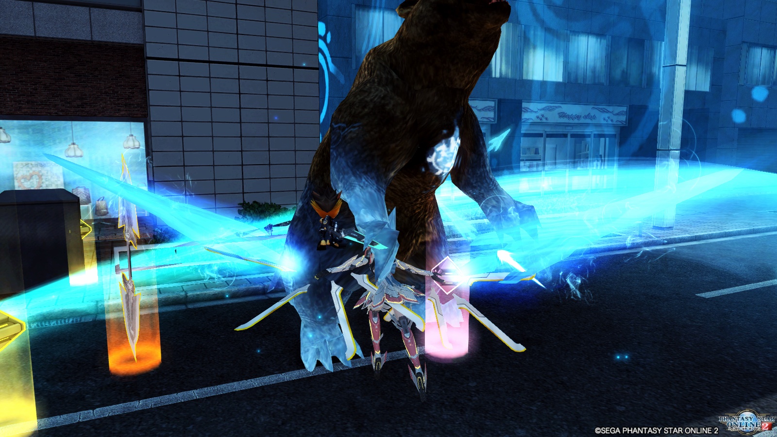 そしてケストレルランページ零式。もともと畳み掛けるような連撃でダメージを多く与えられるPAでしたが、それがさらに盤石になりました。ただしギアゲージMAXで使うのが大前提です。そしてPAはゲージ全消費で発動します。それでもギアゲージMAXで使えば、オーバーエンド並の大きなフォトンの刃を両手で振り回し、広範囲に大ダメージを与えられるようになりました。最後にタゲっていたところにブレードが降り注ぐところまで当てきれば、かなりのダメージが期待できると思います。