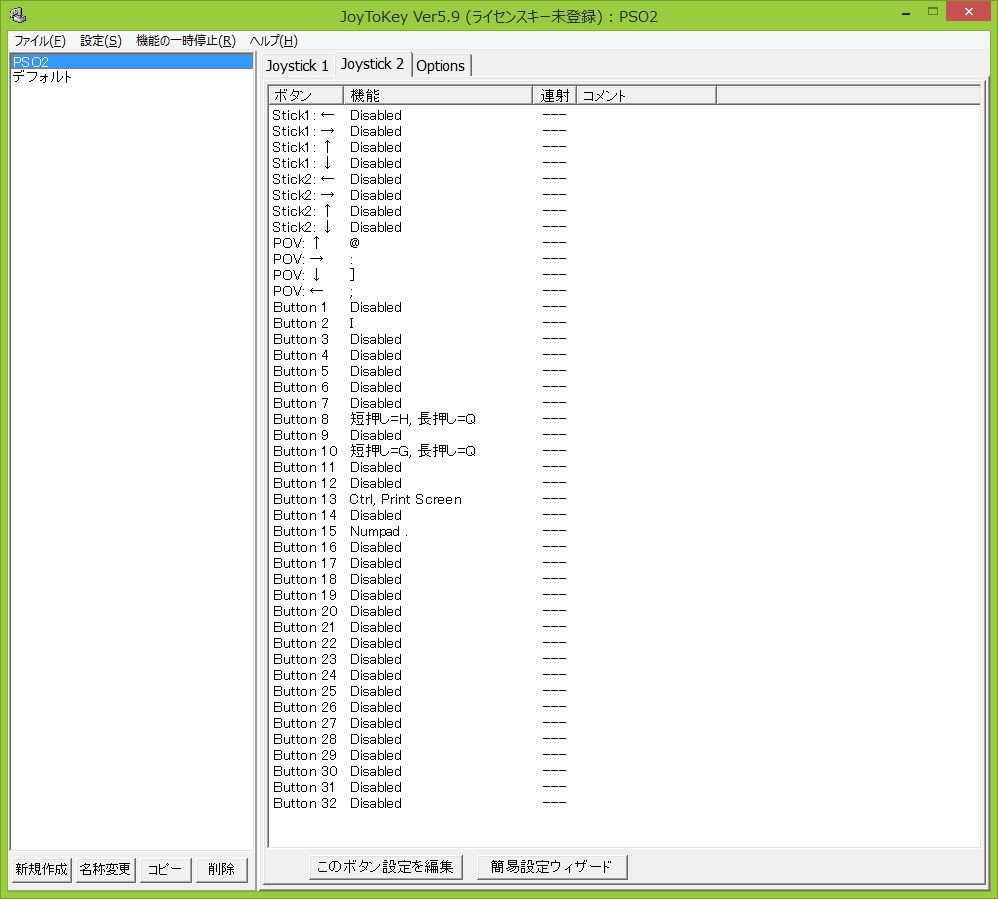 まずは表(おもて)の設定。Stick1・Stick2は左右のアナログスティックで、PCVが十字キーです。この辺は弄ると却って面倒になるので触れません(…つまり「Disabled」のまま)。