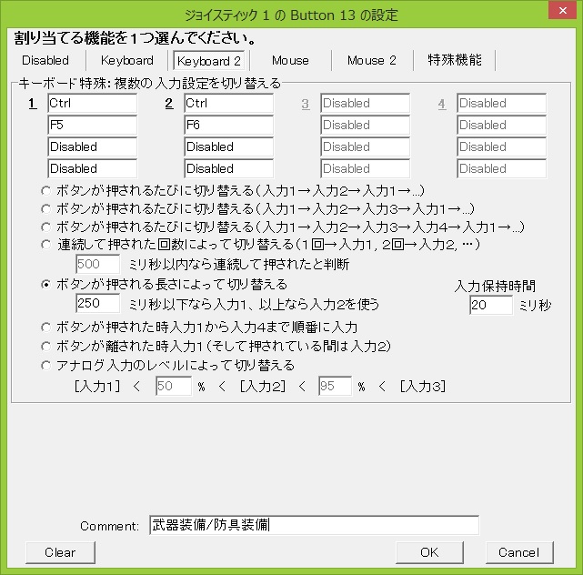 1にCtrl+F5、2にCtrl+F6を登録するイメージです。で、真ん中あたりにある「ボタンが押される長さによって切り替える」のラジオボタンを選択し、その切替時間を 250 ミリ秒以下に設定しています。