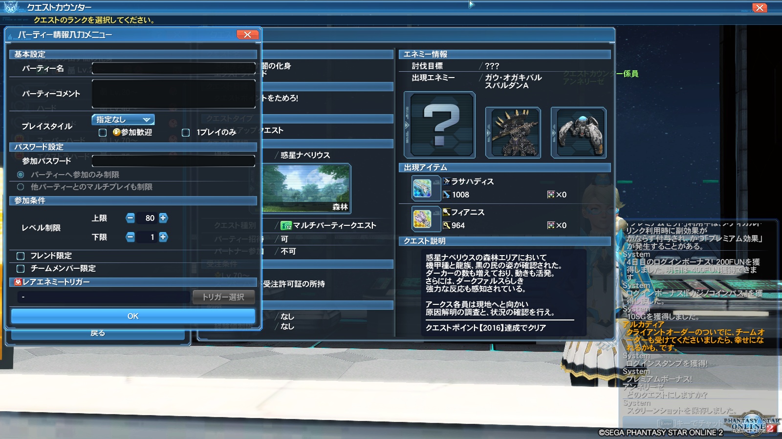 そんな感じでコレクトファイルのゲージ上げも色々工夫できるのですが、最終的には特定のエネミーを何度も倒すべく同じクエストを周回する…ということもあるかと思います。そういう場合は、なんとかしてパーティーを組みたいものです。その辺の事情を本文では書いてみます。…といっても目新しい情報があるわけではないので、知ってる方はスルーするか間違いがないかチェックするという方向で…。