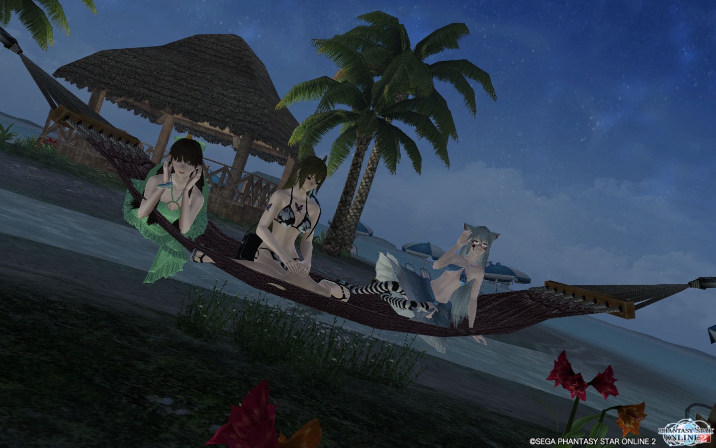 あと、この浜辺にはハンモックがぶら下がっているところがあるので、そこに3人で乗ってみます。