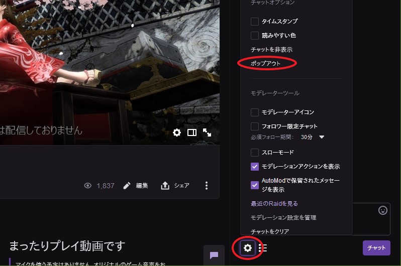このチャット画面の下の方の 歯車のアイコンをクリックすると、メニューが開かれます。その中に「ポップアウト」というのがあって、それをクリックするとチャット画面だけが別ウィンドウになります。もちろんサイズも好きなように変更できます。